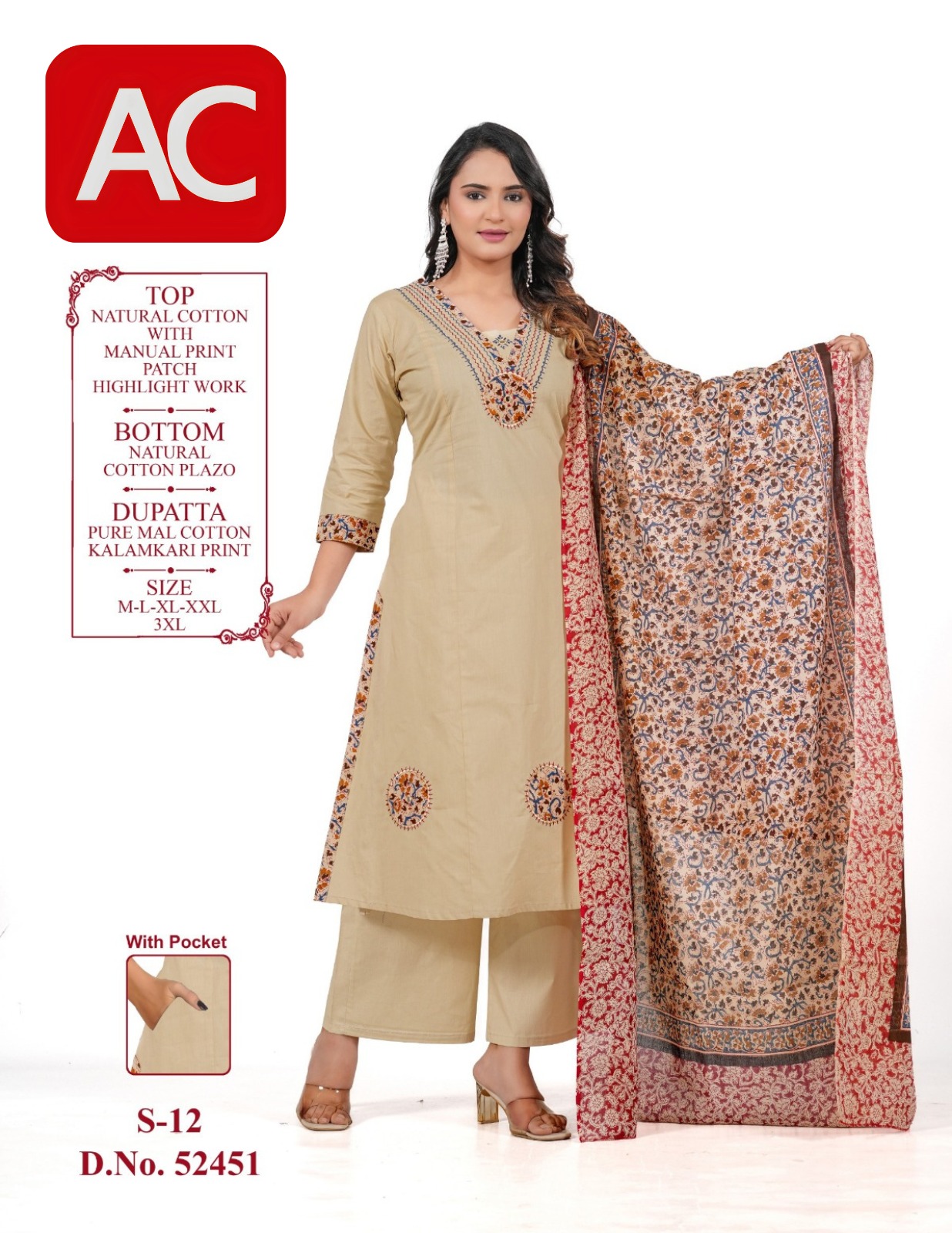 Beige Cotton Kurta Palazzo Set with Floral Kalamkari Dupatta