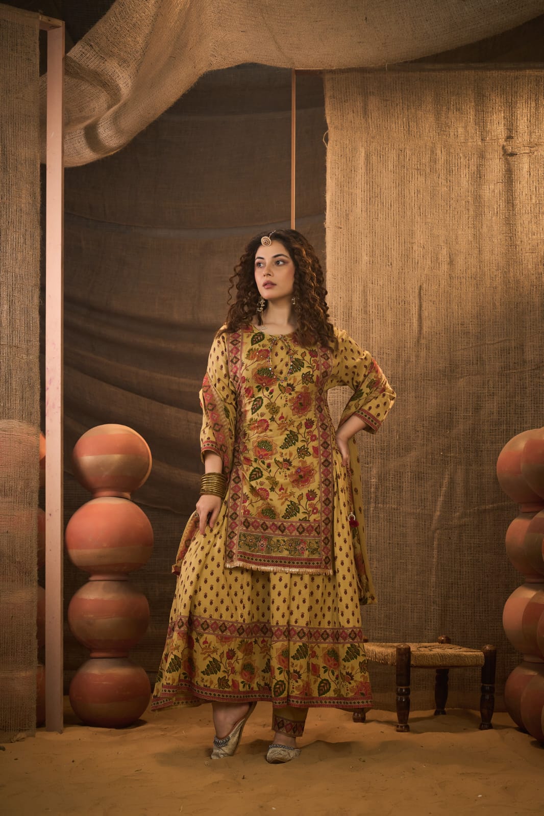 Elegant beige ethnic kurti set featuring traditional floral prints and rich border detailing. Paired with matching bottom and dupatta, perfect for festive and traditional wear.