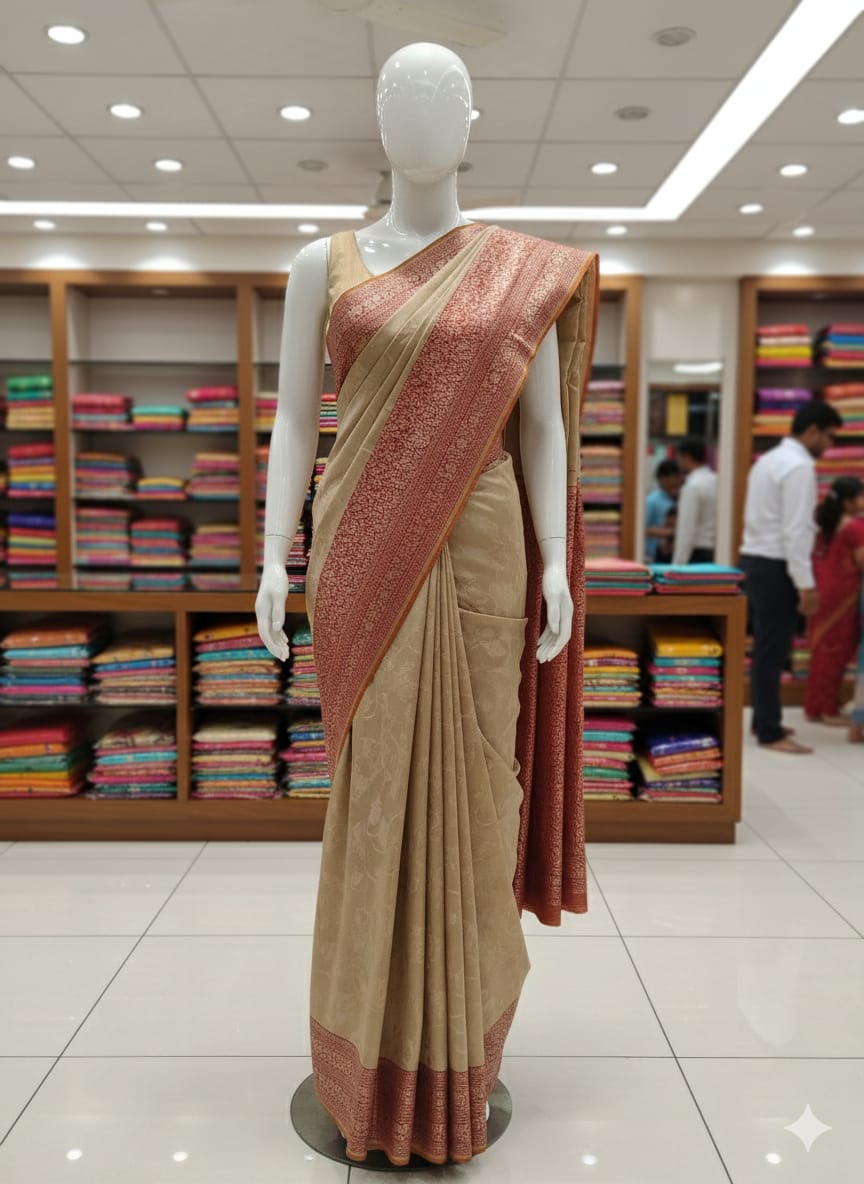 This elegant beige tissue silk saree showcases a luxurious sheen with a soft, graceful drape. The saree features a rich maroon zari woven border and a beautifully detailed pallu that adds depth and contrast to its subtle body. Crafted from lightweight tissue silk, this saree reflects understated sophistication, making it an excellent choice for weddings, festive occasions, and formal celebrations.
