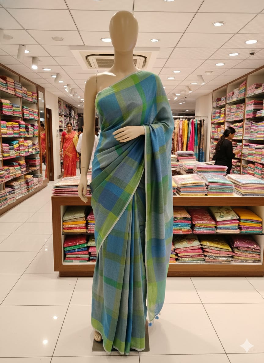 Blue & Green Checked Linen Saree with Tassel Pallu