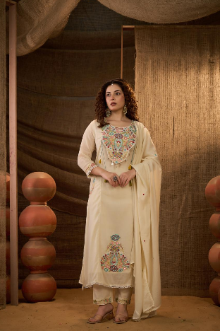 Cream Embroidered Kurta Set with Dupatta