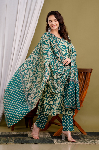 Emerald Green Floral Printed Cotton Kurta Pant Set with Dupatta
