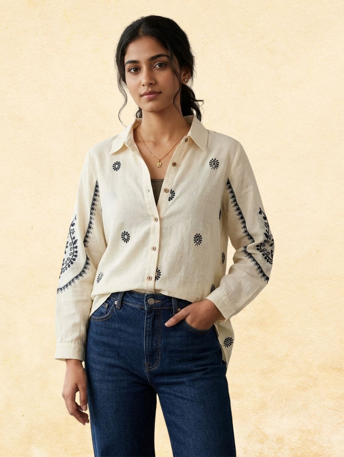 Ivory Embroidered Linen Shirt — Women’s Boho Block Print Button-Down Top