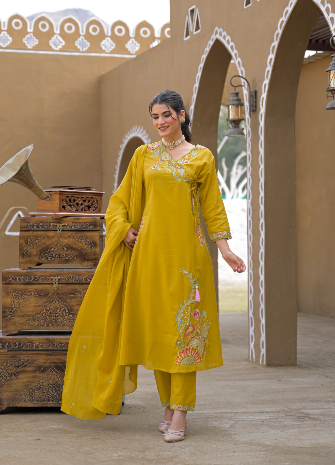 Mustard Yellow Floral Embroidered Cotton Kurta Pant Set with Dupatta