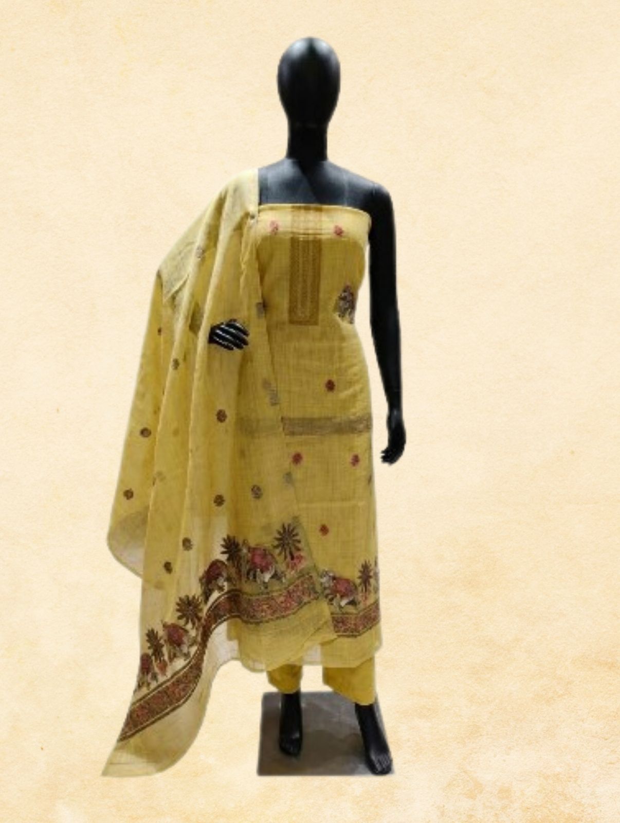A celebration of traditional Indian weaving, this mustard yellow unstitched dress material is crafted in fine Jamdani fabric — known for its lightweight, breathable weave and subtle self-check texture. The kurta piece is beautifully adorned with Resham (silk thread) hand embroidery bootis and a classic neck patch detail. The sheer Jamdani dupatta features a rich Kalamkari hand-painted border with traditional motifs of elephants, florals, and palm trees. A timeless 3-piece unstitched set — ideal for festivals, pujas, casual occasions, and as a thoughtful gift.