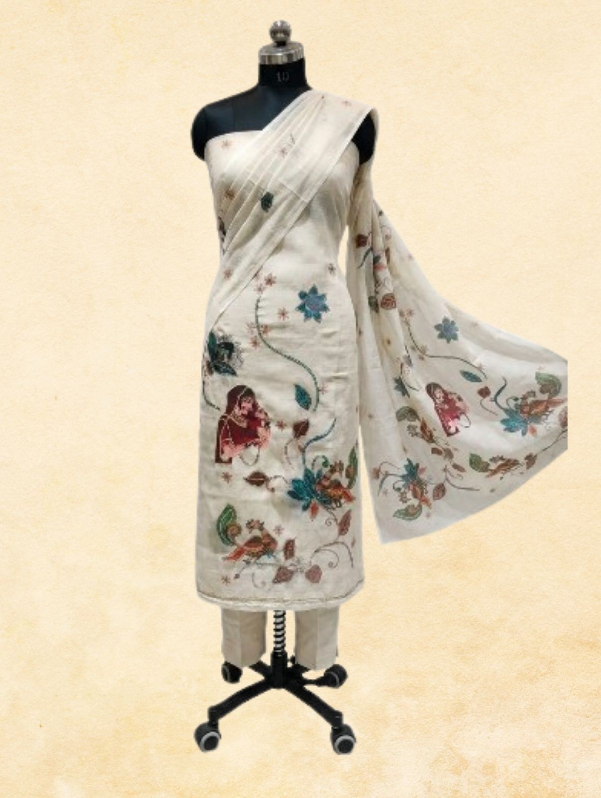 Celebrate the beauty of traditional Indian craft with this breathable off-white Linen unstitched dress material. The kurta fabric and dupatta are enriched with intricate Katha hand-painted artwork — showcasing Rajasthani Banjaran figures, lotus blooms, parrots, deer, and flowing vine motifs in rich earthy multicolour tones. The plain beige-cream linen bottom keeps the ensemble poised and elegant. Lightweight, comfortable, and artisan-crafted — ideal for festive gatherings, cultural events, and casual ethnic occasions. Stitch to your perfect fit for a one-of-a-kind look.