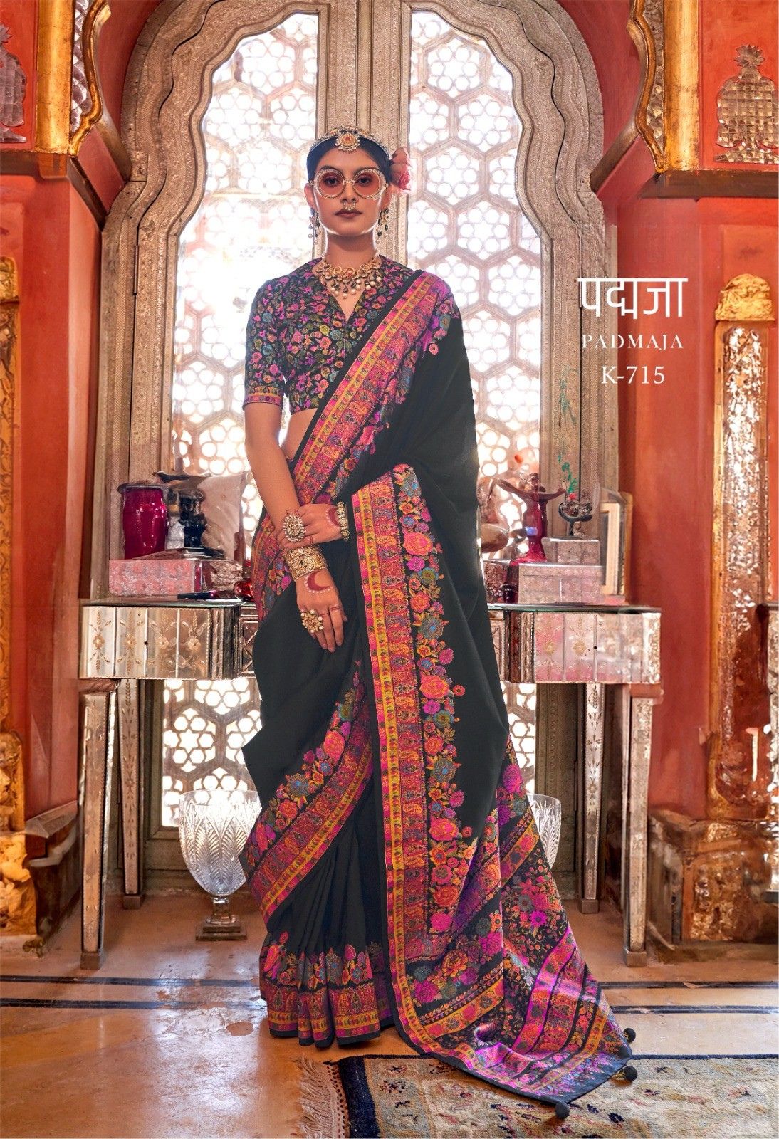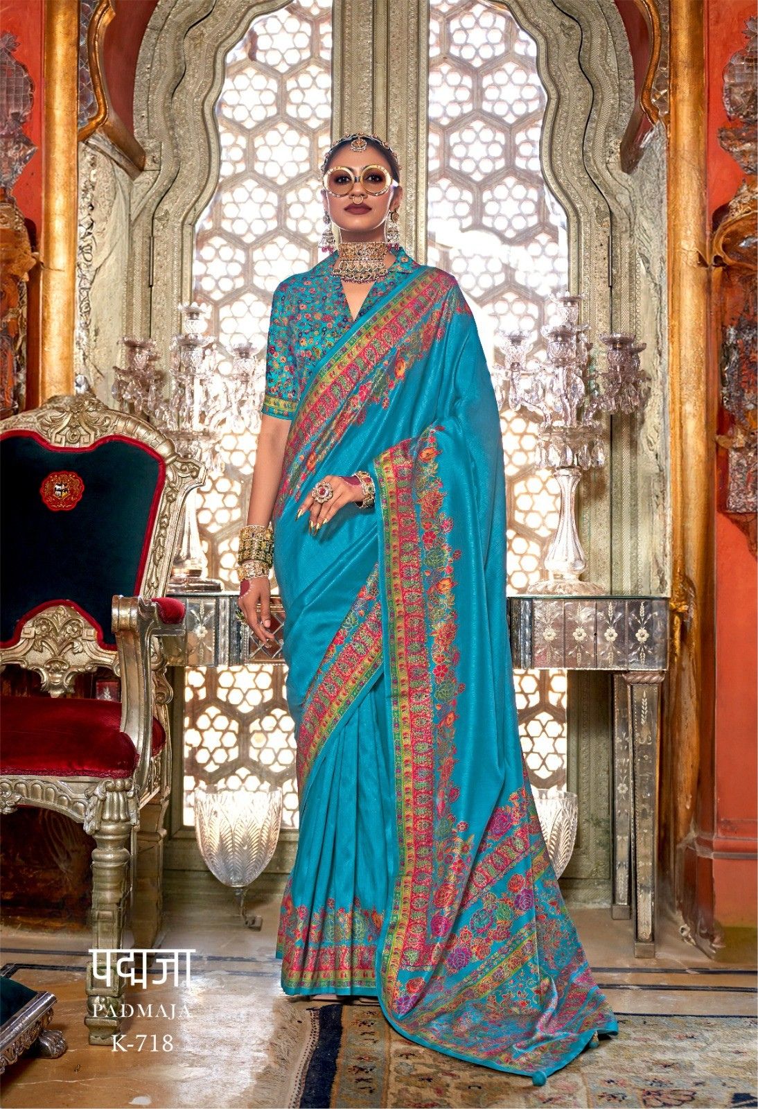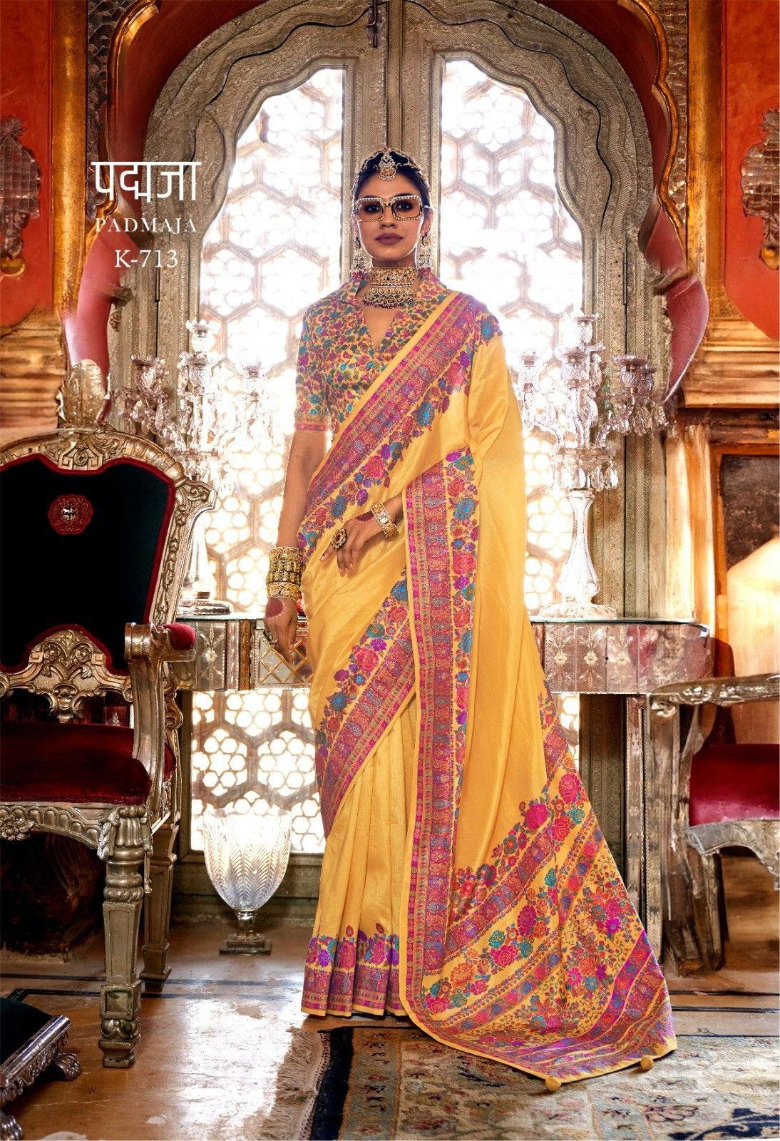 Radiate warmth and elegance with this Padmaja K-713 Designer Saree in a glowing sunshine yellow shade. Featuring a richly detailed multicolor floral Kashmiri-inspired printed border and pallu with vibrant blooms in pink, blue, and purple tones, the clean yellow body creates a striking contrast that exudes festive charm. Paired with a matching printed blouse in coordinating floral tones, this saree is a breathtaking choice for weddings, sangeet ceremonies, and festive celebrations.
