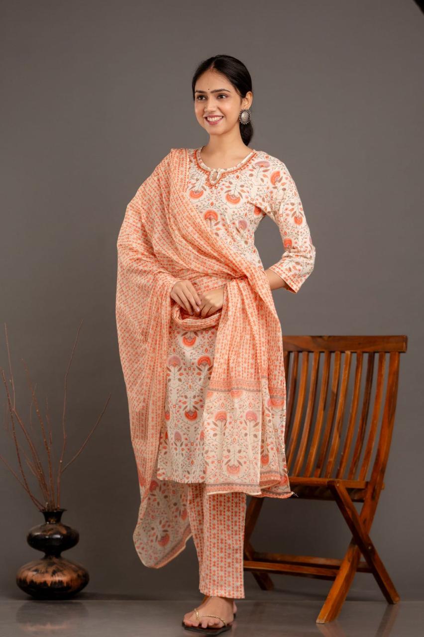 Peach Blossom Printed Cotton Kurta Pant Set with Dupatta