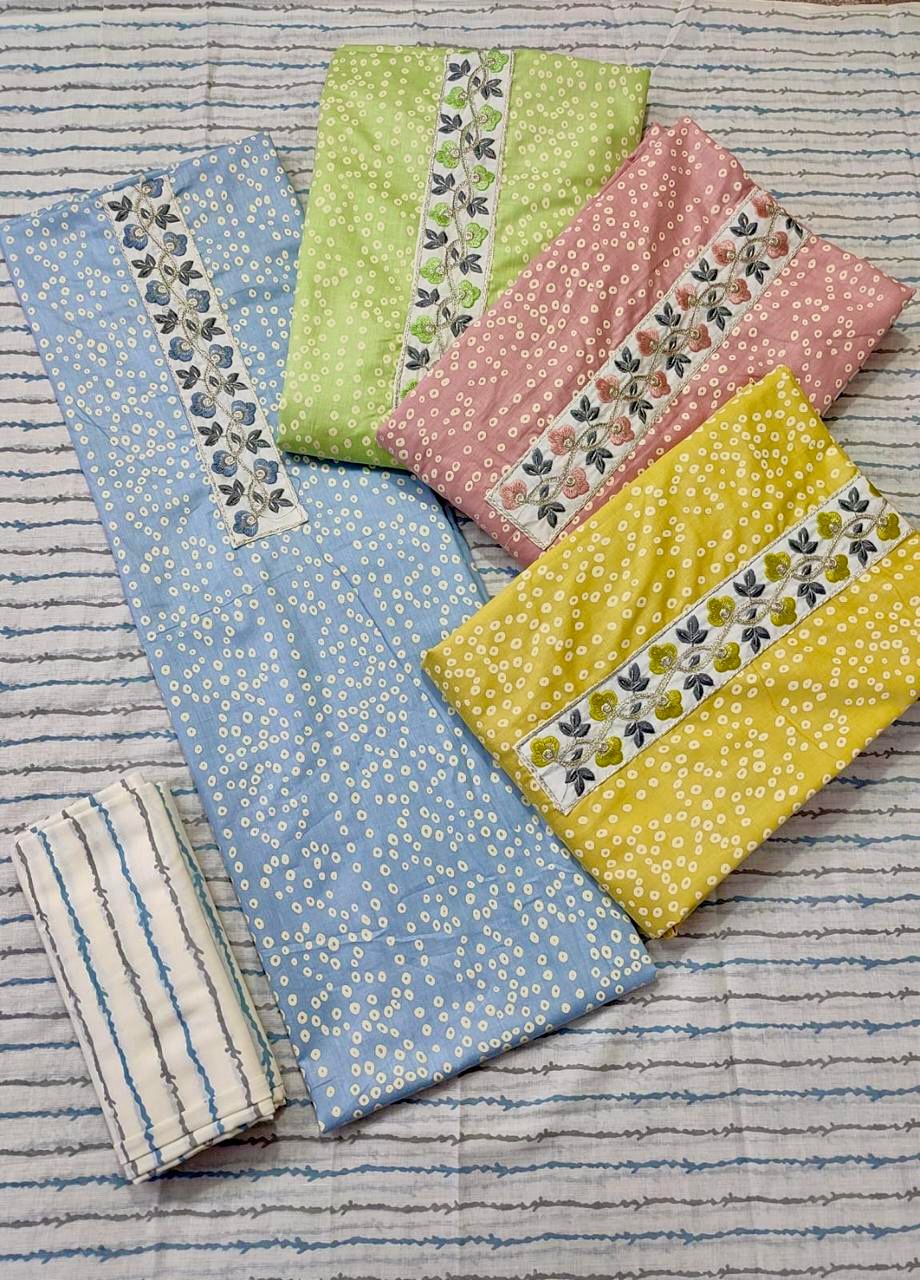 Add comfort and elegance to your wardrobe with this premium cotton dress material set. Crafted from breathable cotton fabric, this unstitched suit material features delicate all-over prints enhanced with a stylish embroidered panel on the kurta fabric. Paired with a coordinated bottom fabric and a soft contrast dupatta, this dress material is perfect for everyday wear while maintaining a graceful ethnic appeal.