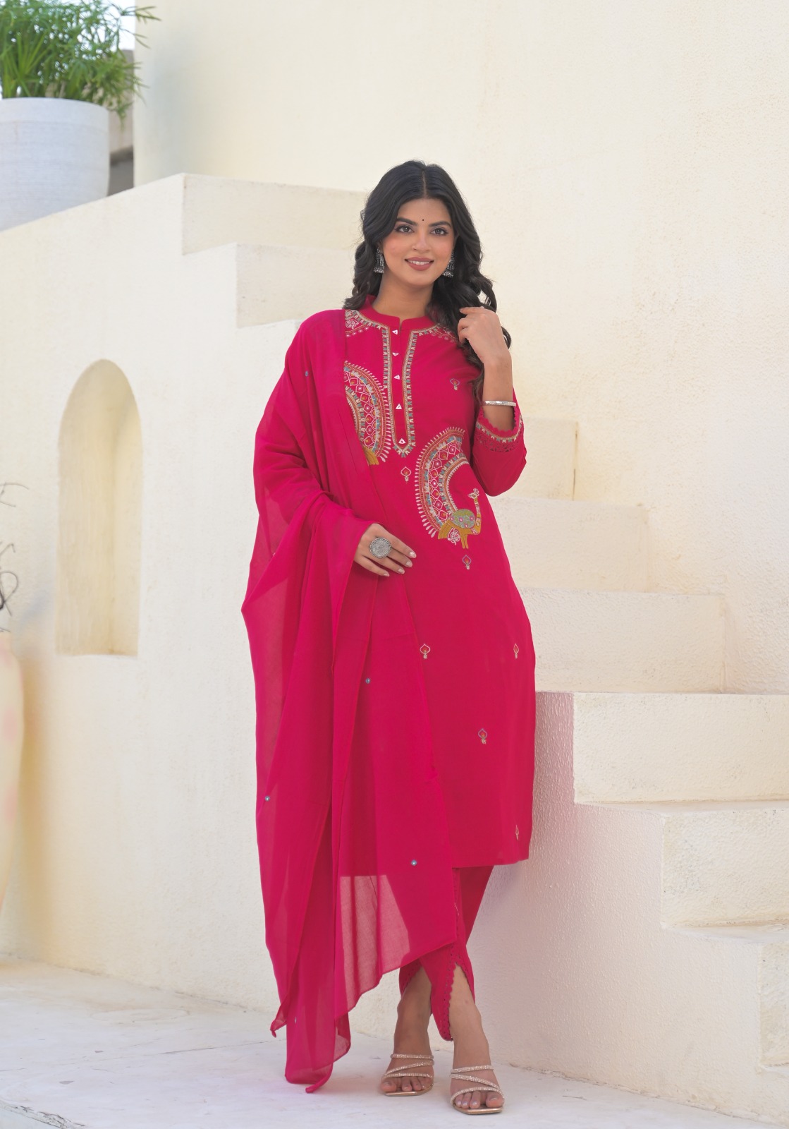 This graceful Pure Jaipur cotton kurti set is designed for comfort and timeless ethnic elegance. Crafted from breathable Jaipur cotton fabric, the kurti showcases delicate traditional embroidery inspired by Rajasthani craftsmanship, adding a refined and festive touch.