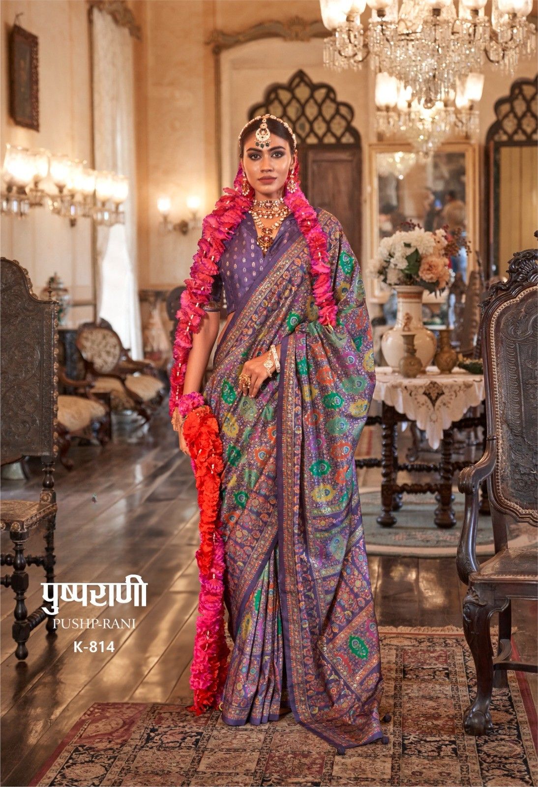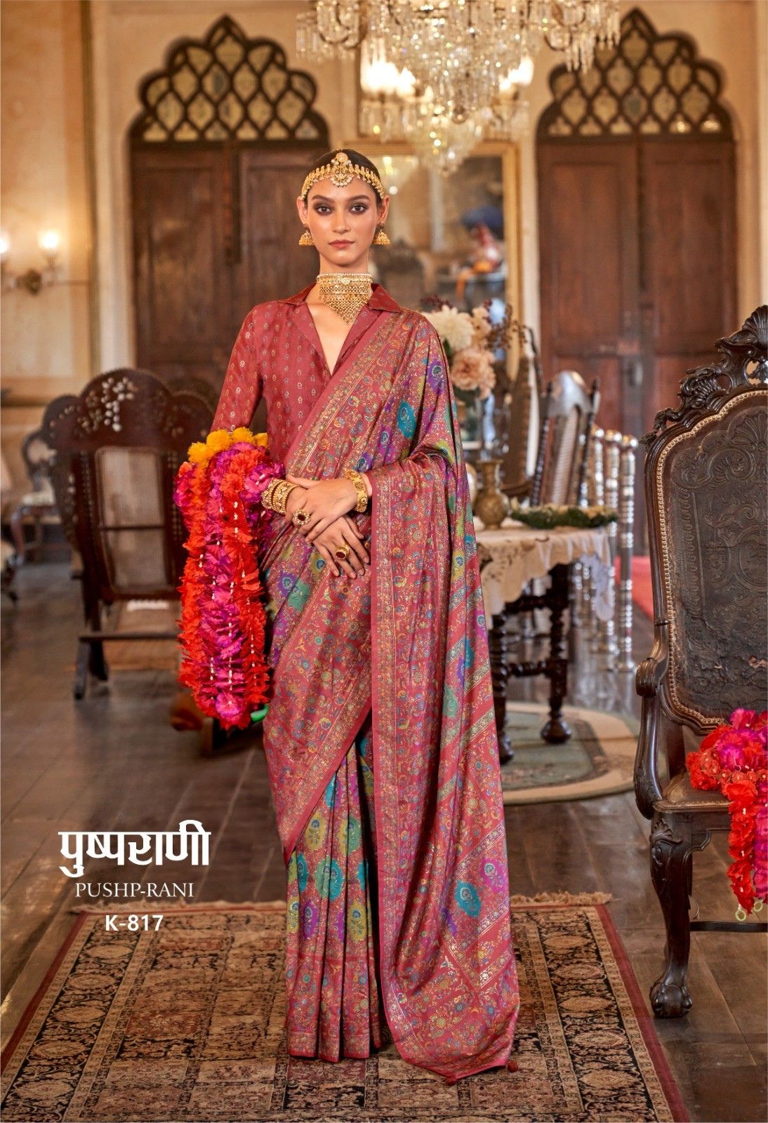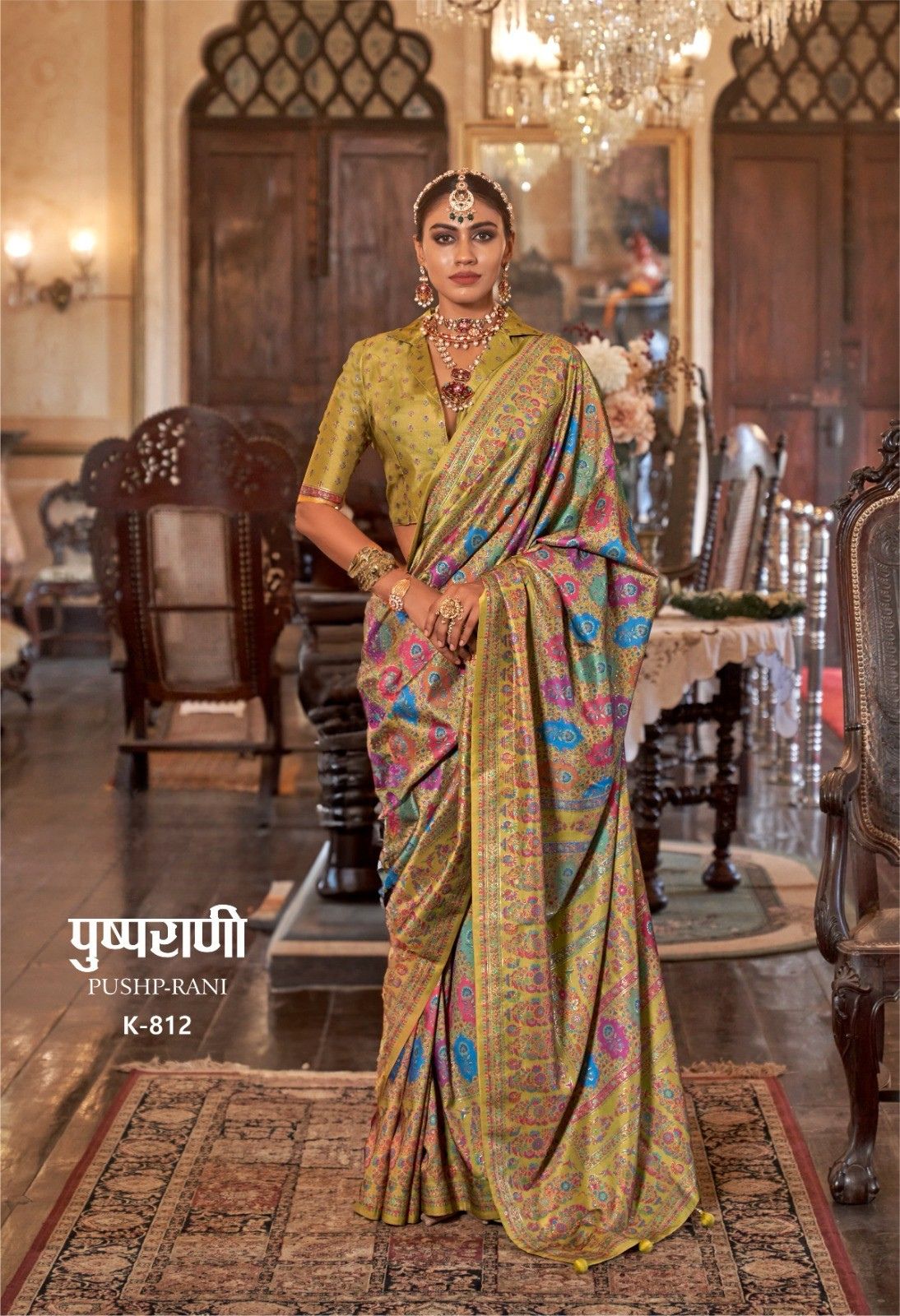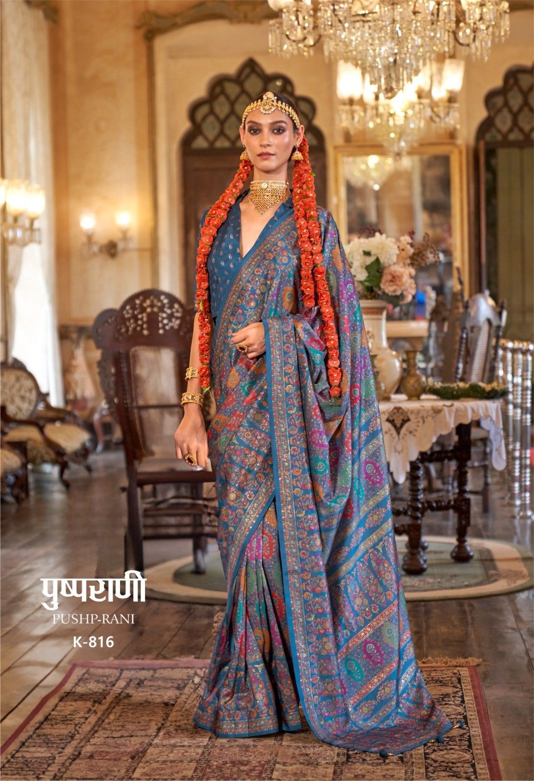 Step into regal splendour with this Pushp-Rani K-815 Designer Saree in a rich royal blue base adorned with an all-over multicolor floral medallion print. Inspired by classic Persian and Mughal textile art, the intricate circular motifs in jewel tones of teal, mustard, coral, and green cover the entire drape, creating a tapestry-like effect. Finished with a delicate cream and gold trim border, this saree is an exquisite choice for weddings, bridal functions, and premium festive occasions.
