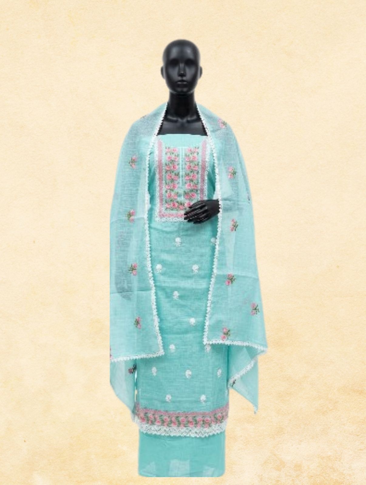 Stay cool and elegant with this refreshing sky blue Kota fabric unstitched dress material. The lightweight Kota weave is adorned with delicate pink and white floral resham embroidery scattered across the kurta and bottom fabric. The square neck patch features dense floral threadwork with a white lace trim framing. The matching Kota dupatta carries the same scattered floral embroidery and is finished with a crisp white crochet lace border on all sides — making it a complete, ready-to-stitch 3-piece set perfect for summer festivals, Eid, and casual occasions.