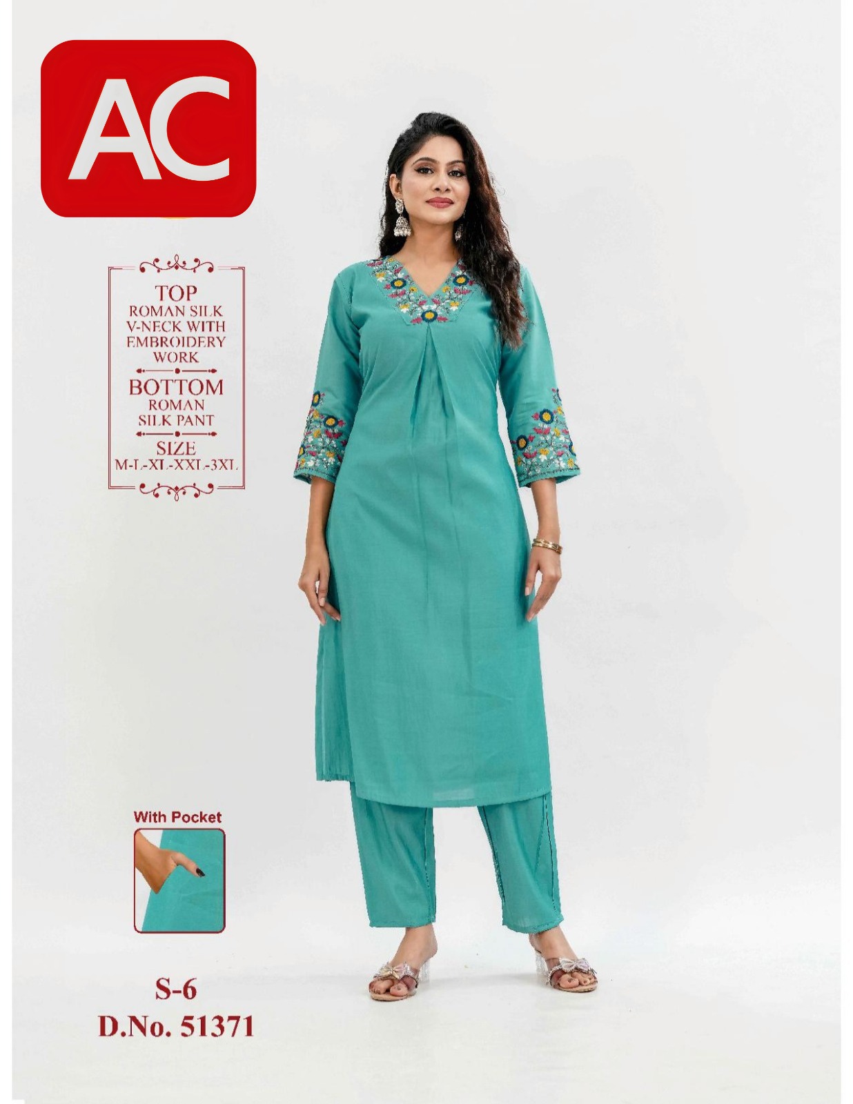 Teal Green Roman Silk V-Neck Embroidered Kurti Set with Pant & Pocket
