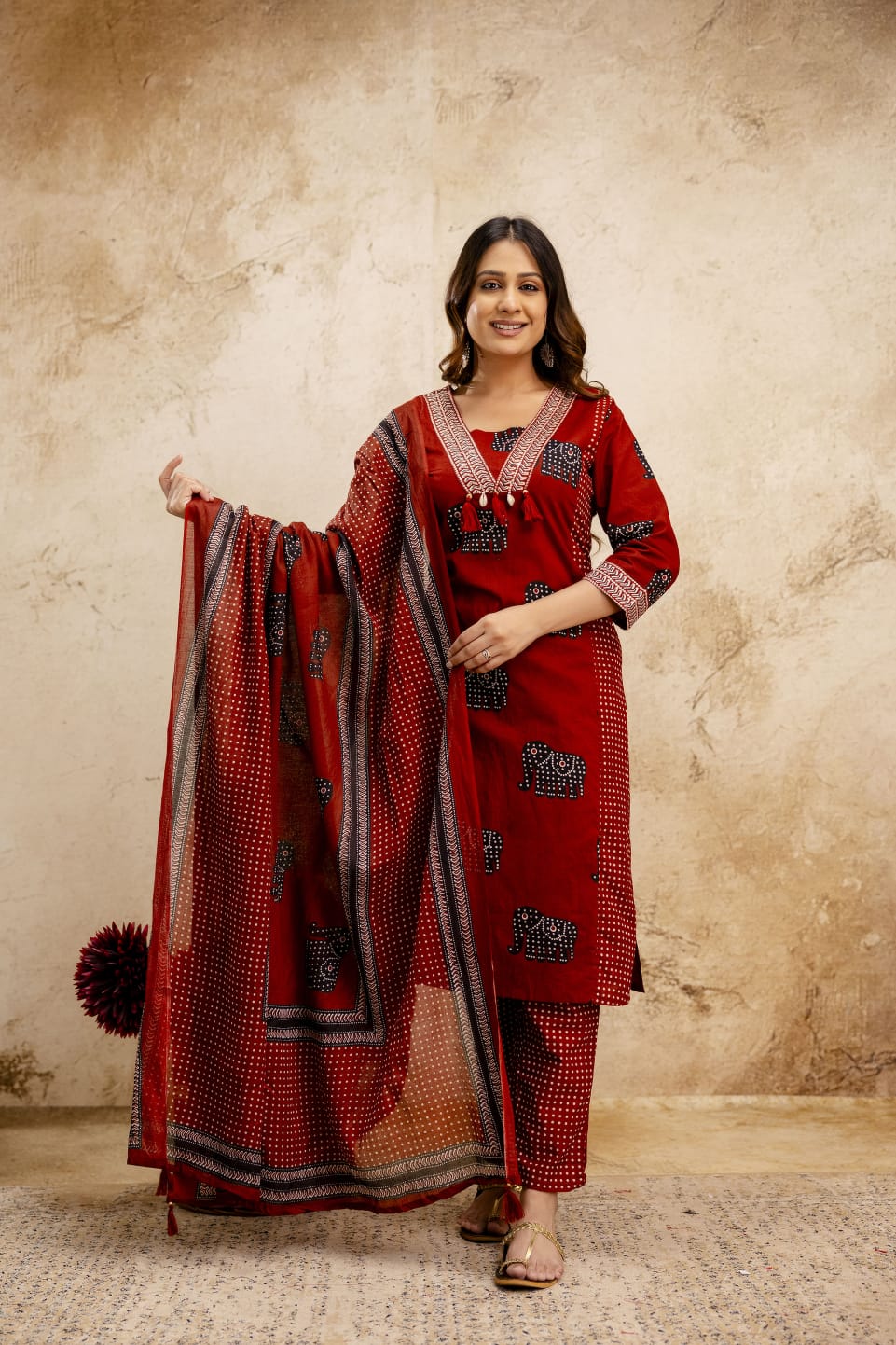 Elevate your ethnic wardrobe with this elegant maroon printed kurta set, crafted to bring together traditional charm and everyday comfort. The kurta features classic ethnic elephant motifs paired with fine dotted prints, creating a rich and graceful look. Designed in a breathable cotton blend fabric, this outfit ensures comfort throughout the day while maintaining a polished appearance.